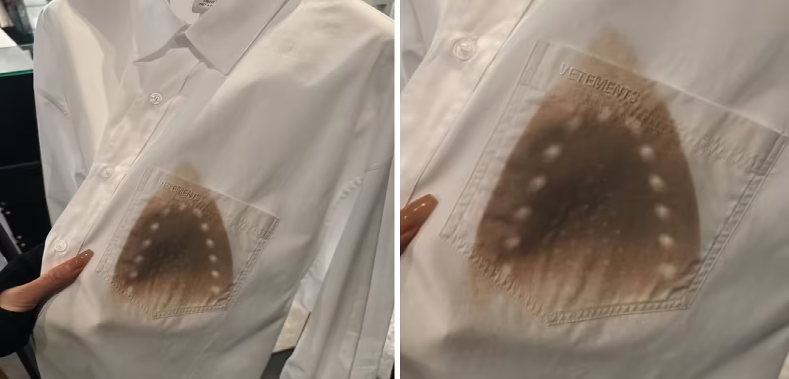 स्विस-फ्रेंच लग्जरी ब्रांड ‘वेटमेंट्स’ (Vetements) ने अपनी क्रिएटिविटी के नाम पर इस अजीबोगरीब शर्ट को बाजार में उतारा है। इसका नाम ‘व्हाइट आयरन बर्न ग्राफिक शर्ट’ रखा गया है। इसे देखकर ऐसा लगता है कि जैसे किसी ने गर्म प्रेस को शर्ट के पॉकेट पर ज्यादा देर तक छोड़ दिया हो, जिससे वहां भूरे रंग का जलने वाला निशान बन गया है। ब्रांड का दावा है कि यह एक विशिष्ट डिजाइन है।